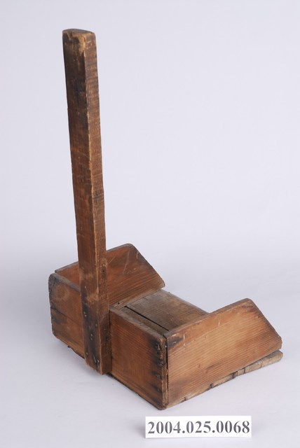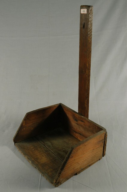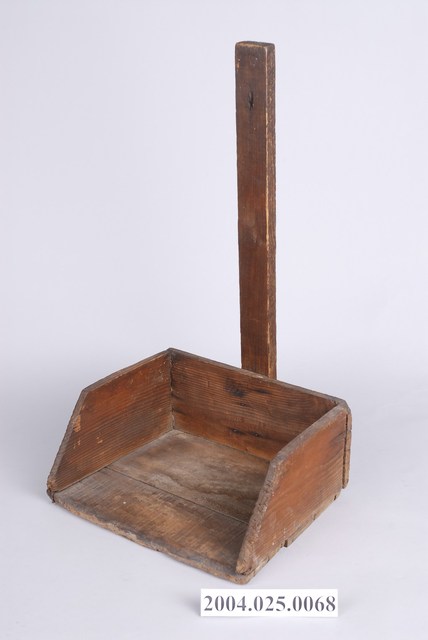 本物件為木製畚斗,握把處為長形木材,下方鏟狀部分則為木材拼接而成,狀似抽屜,開口一側有斜切面。畚箕為鏟狀器具,用以裝載垃圾,與掃把搭配使用。