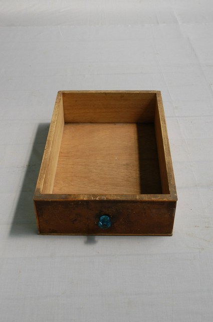 1.本藏品是木製附臉盆架洋風矮櫃的左抽屜,長47.2公分、寬29公分,高10.4公分,整體構造簡單,以榫卯及鐵釘連接各部件,僅在正面面板上乾漆,面板中央有藍色玻璃拉把,以螺絲鎖在面板上。整體而言構造簡單,給人實用之感。