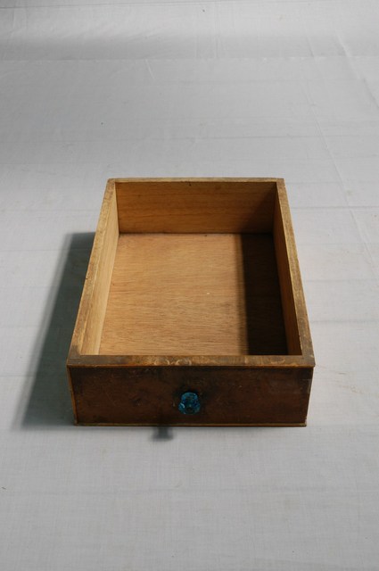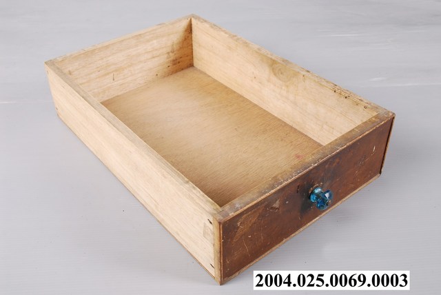 1.本藏品是木製附臉盆架洋風矮櫃的右抽屜,長48.2公分、寬29.2公分,高10.4公分,整體構造簡單,以榫卯及鐵釘連接各部件,僅在正面面板上乾漆,面板中央有藍色玻璃拉把,以螺絲鎖在面板上。整體而言構造簡單,給人實用之感。