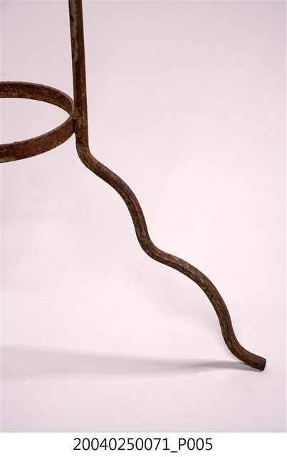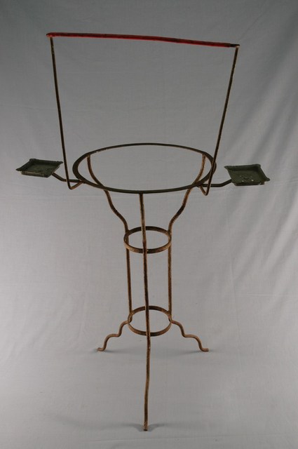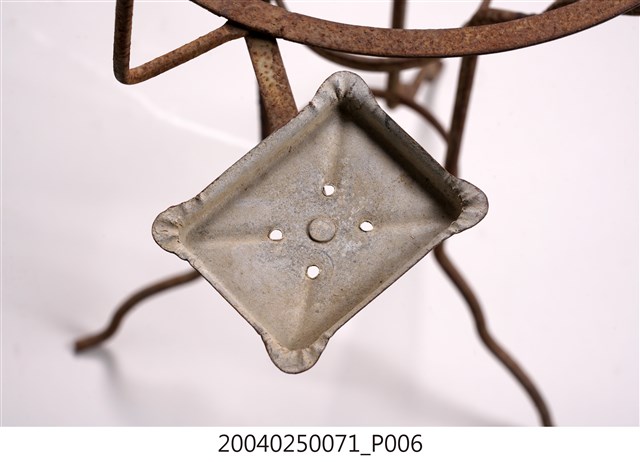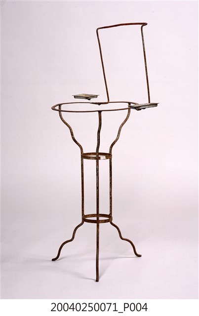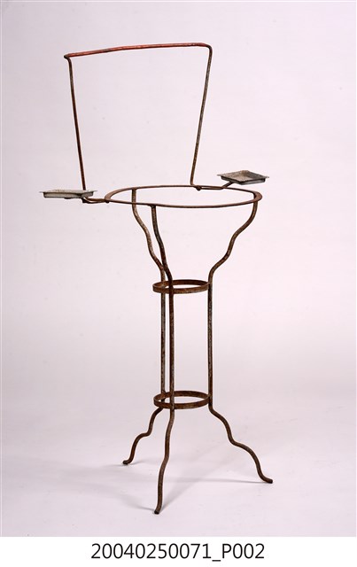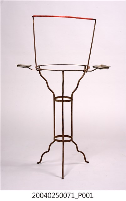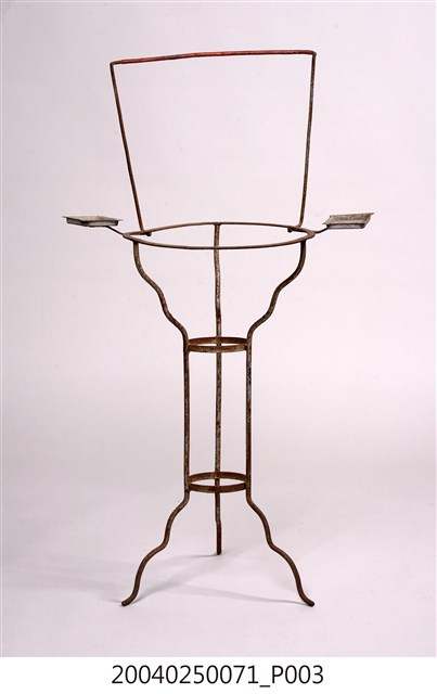 1. 本藏品是鐵絲臉盆架,長36公分、寬57.5公分,高94.8公分,整體以鐵絲彎撓而成,較高的毛巾架為簡單的倒梯形,盆架部分則是簡單的圓形鐵環,鐵環兩側則各有一個皂盒,臉下有3足向下作階梯狀收束到腰部較小鐵環處,兩個小鐵環與3根縱向鐵絲形成束腰,其下器足又向作階梯狀外敞直至末端。