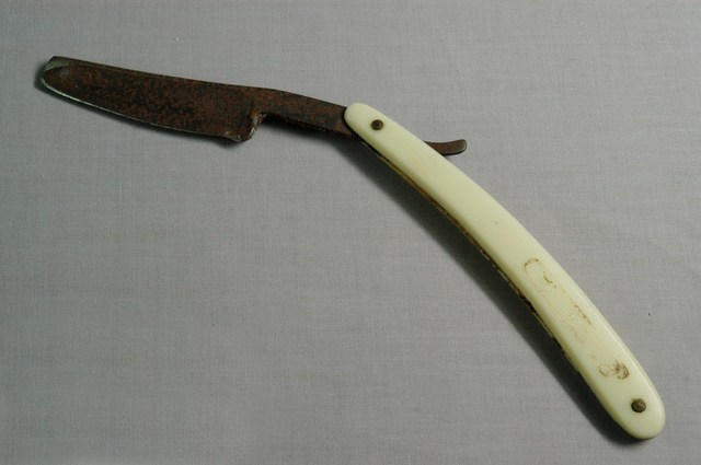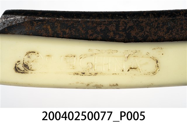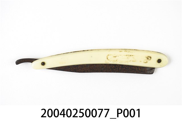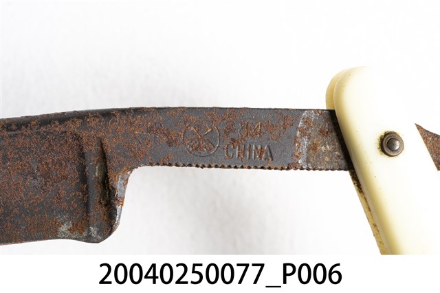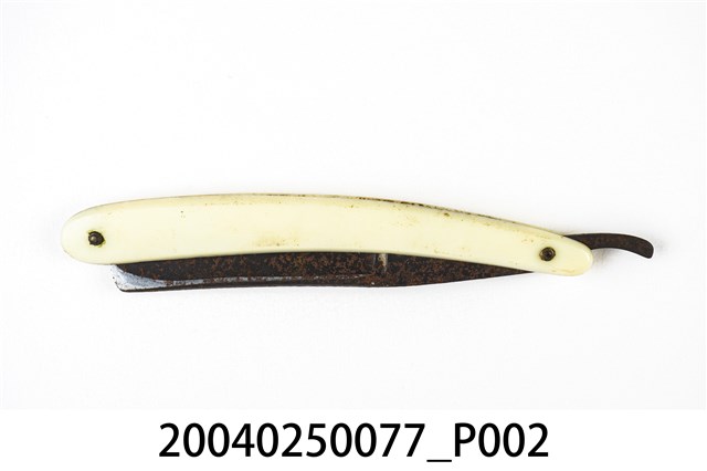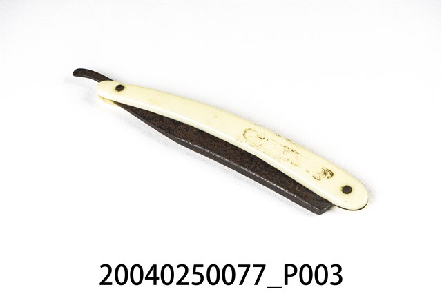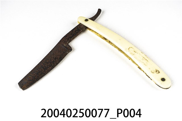 1.本件白柄塑膠直式剃刀為傳統刮鬍刀樣式,可分為刀身與刀柄2部分,呈長24.5公分,寬2.4公分,高1公分。刀身以鐵打造而成,刀面呈黑底,表面略帶褐色鏽斑,外型呈長條形薄片狀,前端長邊延伸出薄形刀鋒身略帶弧線捲曲,其兩側面研磨後作單邊兩面開鋒,打磨之部分露出金屬亮銀色。刀身後端邊緣帶有鋸齒狀,其面打印有圓環形商標與「CHINA」英文字樣,尾端成條形起翹。刀柄以2片白色塑膠製成,並於兩端點鑽孔插入金屬榫後,一端與刀身固定。刀柄採夾合方式使之中央帶有溝槽可摺疊收納剃刀,其刀柄正面另陰刻有商標與「CHINA」英文字樣。2.傳統的刮鬍刀具為直式剃刀,由於剃刀過於鋒利且難以自行處理,男性大多需要到理髮店鋪請專業的理髮師修整鬍鬚,除修整鬍鬚之外,還可作剃髮使用。