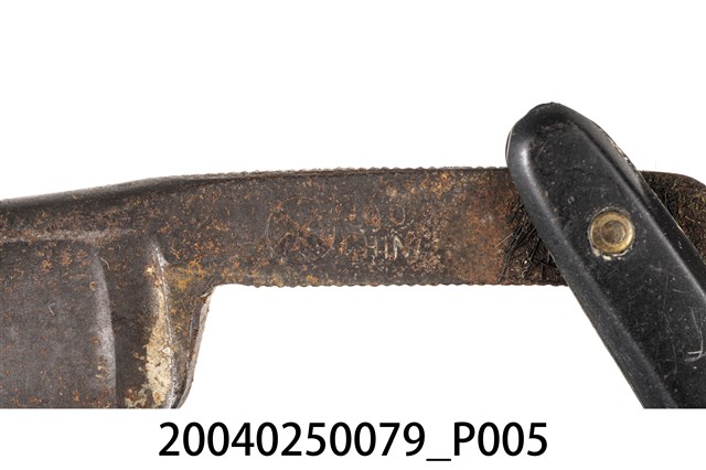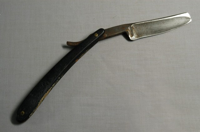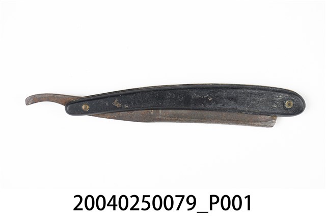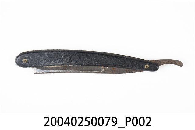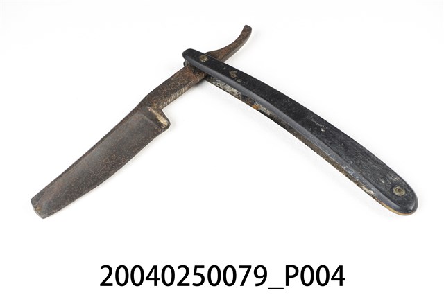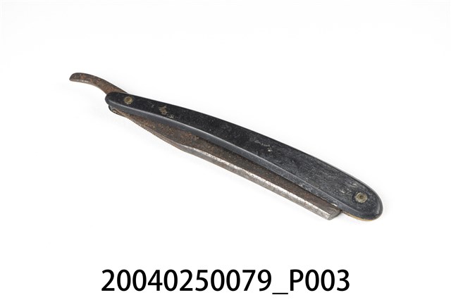 1.本件黑色木柄直式剃刀為傳統刮鬍刀樣式,可分為刀身與刀柄2部分,呈長24公分,寬2.8公分,高1.2公分。刀身以鐵打造而成,正面刀面呈黑底,背面刀面呈金屬原色,外型為長條形薄片狀,前端長邊延伸出薄形刀鋒身略帶弧線捲曲,其兩側面研磨後作單邊兩面開鋒。刀身後端邊緣帶有鋸齒狀,其面由於打印紋路較淺,僅能辨識帶有圓環形商標與「CHINA」字樣,尾端成條形起翹。刀柄以2片黑色木材製成,並於兩端點鑽孔插入銅鉚釘後,一端與刀身固定。刀柄採夾合方式使之中央帶有溝槽可摺疊收納剃刀。2.傳統的刮鬍刀具為直式剃刀,由於剃刀過於鋒利且難以自行處理,男性大多需要到理髮店鋪請專業的理髮師修整鬍鬚,除修整鬍鬚之外,還可作剃髮使用。