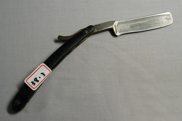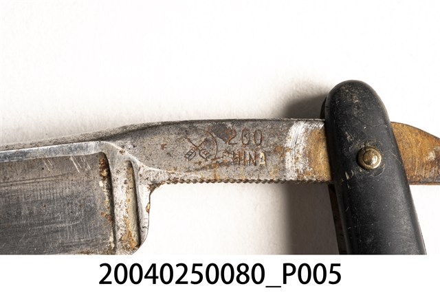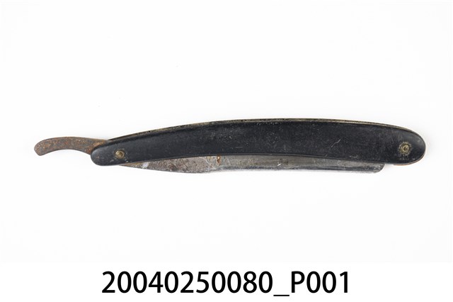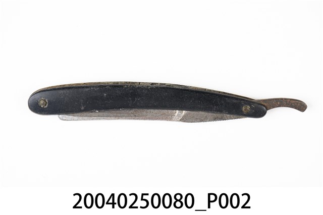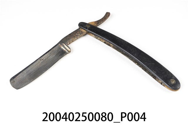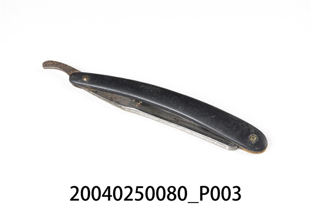 1.本件黑色木柄直式剃刀為傳統刮鬍刀樣式,可分為刀身與刀柄2部分,呈長23.8公分,寬3.1公分,高1公分。刀身以鐵打造而成,刀面呈金屬原色,外型為長條形薄片狀,前端長邊延伸出薄形刀鋒身略帶弧線捲曲,其兩側面研磨後作單邊兩面開鋒。刀身後端邊緣帶有鋸齒狀,其面由於打印紋路較淺,僅能辨識帶有圓環形商標與「200」、「CHINA」字樣,尾端成條形起翹。刀柄以2片黑色木材製成,並於兩端點鑽孔插入銅鉚釘後,一端與刀身固定。刀柄採夾合方式使之中央帶有溝槽可摺疊收納剃刀。2.傳統的刮鬍刀具為直式剃刀,由於剃刀過於鋒利且難以自行處理,男性大多需要到理髮店鋪請專業的理髮師修整鬍鬚,除修整鬍鬚之外,還可作剃髮使用。