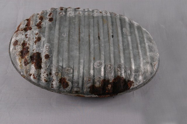 鐵製保溫器,鐵灰色,扁橢圓形,表面有條狀凸起,佈滿大塊褐色鏽斑。保溫器一端有一圓形鈕拴,可從這裡注入熱水,敷在手腳上保溫,用途與現今的暖水袋相同。