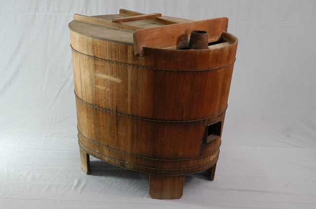 1.此為檜木製浴桶,長約90公分,寬約73公分,高約85.5公分。器身呈侈口深壁橢圓柱形,由寬幅木片組成,壁面外側肩部、腹部及足部由5條金屬線箍製,圈繩處皆有鏽蝕痕跡。器身壁面有多塊木片較長,下方有4處突出作為支撐器身之片形立足。壁面與內側底面以釘固定。橢圓短邊口緣有鑿兩個直向長方形孔洞,可與梯型木片左右兩側榫合,此木片可區隔泡澡區和加熱金屬煙囪,防止燙傷。金屬煙囪位於浴桶之短側邊,煙囪口90度向上,口窄頸寬。煙囪尾端位於橢圓短側邊下腹部之方形孔洞,可放炭火維持水溫,金屬煙囪整體已嚴重鏽蝕。本器含半圓上蓋,上蓋由多塊木片拼接成,蓋頂釘有H形提把,上蓋可保持水溫不易散熱。2.傳統盥洗時,需在大灶燒熱水倒入浴桶之中,調整溫度後再進入洗澡。若上方有接煙囪,亦可直接生火燒水或是加炭保溫。