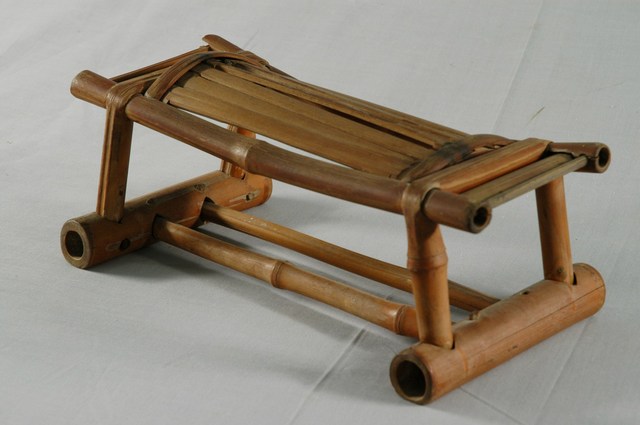 1.本藏品為一方形竹枕,長26.7公分、寬13.5公分,高10.6公分,整體呈現長方形,枕面為竹管與竹片拼接組成,枕面以兩側彎撓竹管榫接底座,底座竹管間榫接兩根細竹管,整體形式作法類似竹椅。總體而言構造簡單結實,給人簡潔樸實之感。