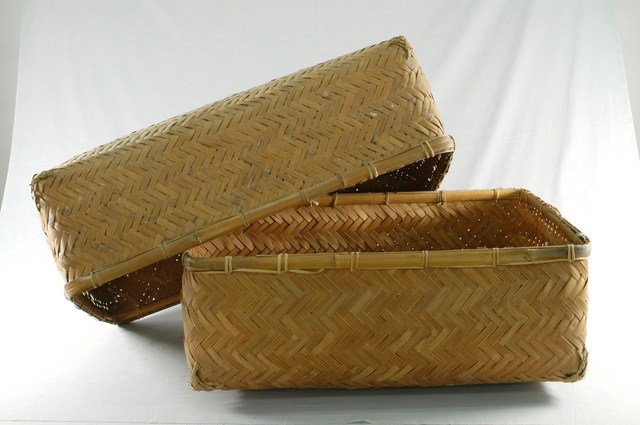 1.本藏品為一方形竹箱,尺寸為長73公分、寬52公分,高33.4公分,整體又可分為箱蓋與箱體兩個部分,不論箱體或箱蓋的開口邊緣皆以較粗的竹蔑連結編織的竹片,是用來固定器形,箱體與箱蓋的器身皆以密集的竹片交叉編織而成,通體沒有施加裝飾,整體而言給人簡潔實用之感。