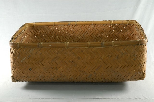 1.本藏品為一方形竹箱的上方箱蓋,尺寸為長73公分、寬52公分,高26公分,開口邊緣以較粗的竹蔑連結編織的竹片,是用來固定器形,方便長期使用,器身則以密集的竹片交叉編織而成,通體沒有施加裝飾或漆料,整體而言給人簡潔實用之感。