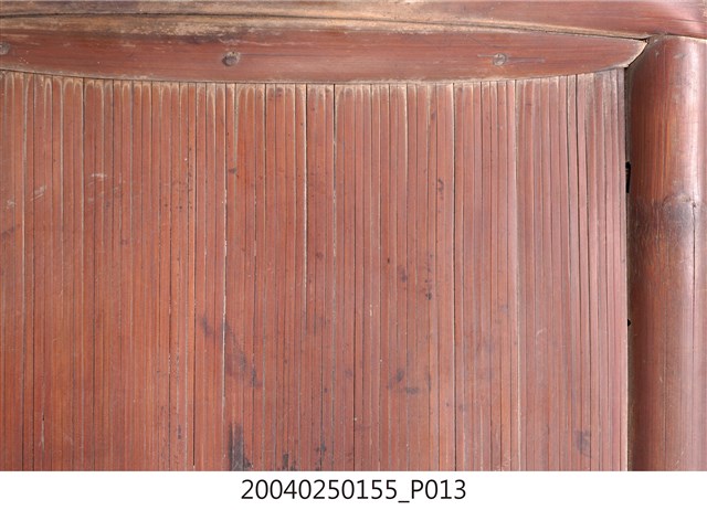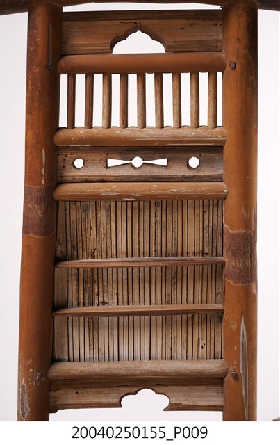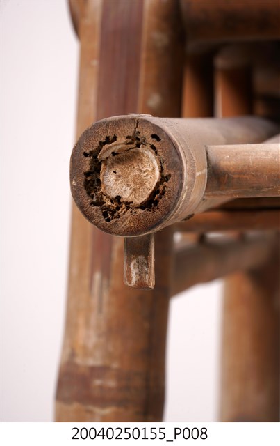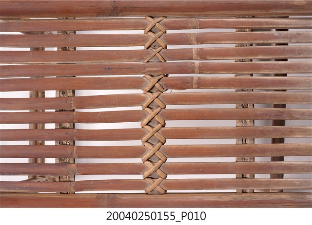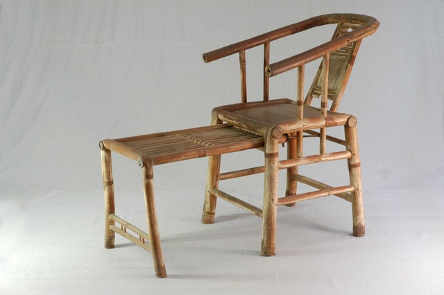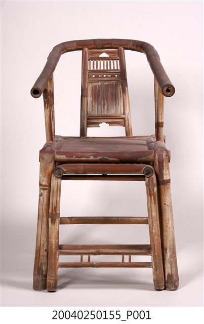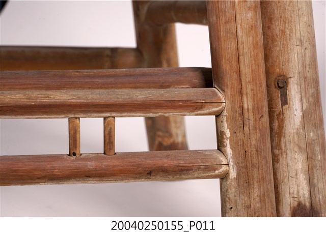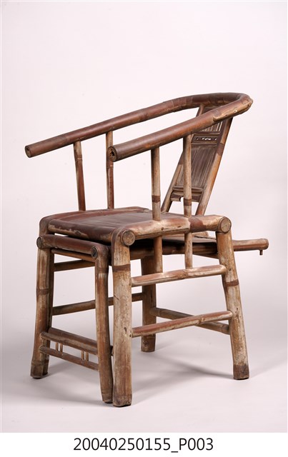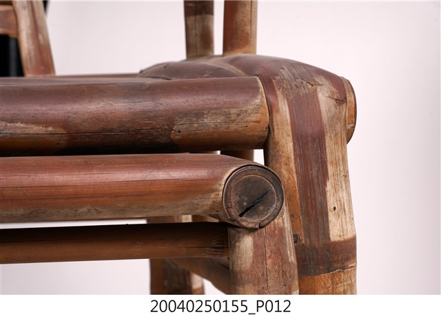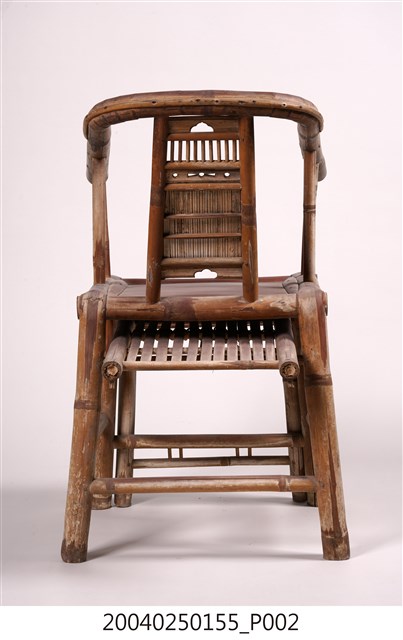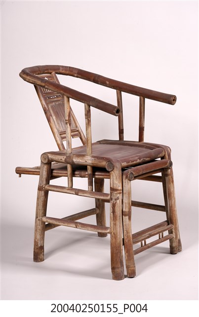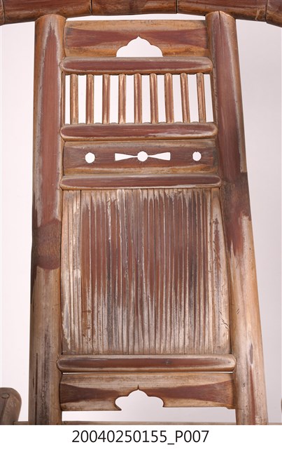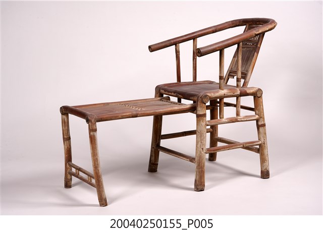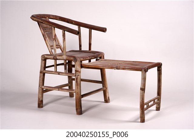 1.本藏品為竹製躺椅,長67.7公分、寬57.9公分,高91.4公分,主體以竹管彎撓榫接而成,椅背與扶手坐大圈椅形式,椅背與椅面為竹片拼接而成。腳靠可收納至椅面下,使用時可拉出,形成長形的躺椅。整體而言造型簡單樸實,但設計頗富巧思。