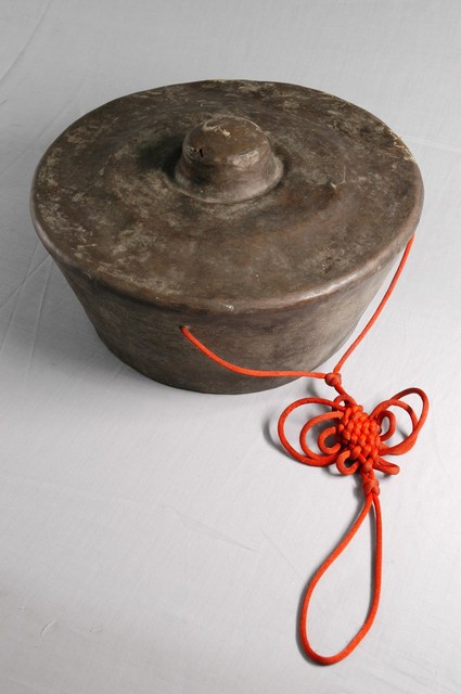 本件為鑼,銅製圓形體上寬下窄,鑼面的鑼臍凸出,紅繩穿孔編結成精緻的中國結。鑼是打擊樂器,使用鑼槌或鑼板敲擊中央區域來發音,依體積分大鑼、小鑼,大鑼音色低沉渾厚,小鑼則是清脆響亮。