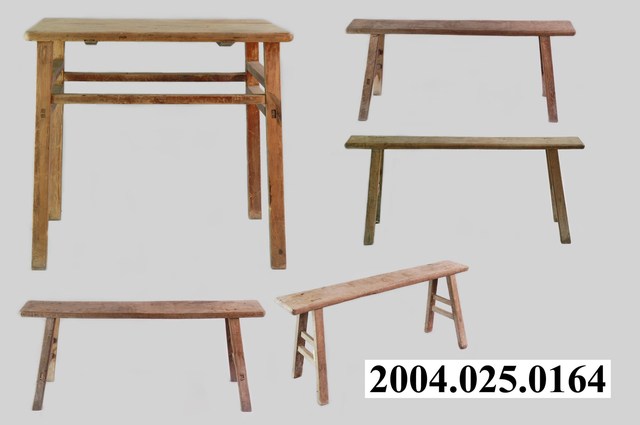 木餐桌板凳組,共1組5件,包括方形的木餐桌1件,搭配4件長條形的板凳,為臺灣傳統用餐的家具組合。這幾件家具皆以原木製成,都用榫卯構造接合而成,器表素面無裝飾,具質樸懷舊之感。