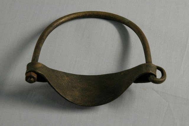 1.本物件為牛鼻栓,為銅材質,為U型銅條與一葉片狀銅片組成,銅條兩端一側有倒鉤,另一側則鎖上螺帽,物件有銅鏽情形。 2.牛鼻栓,當小牛在約2、3歲時,主人會將鐵製或籐製的鼻環,貫穿於牛的兩鼻之間,並系繫上繩索用以牽引耕牛。