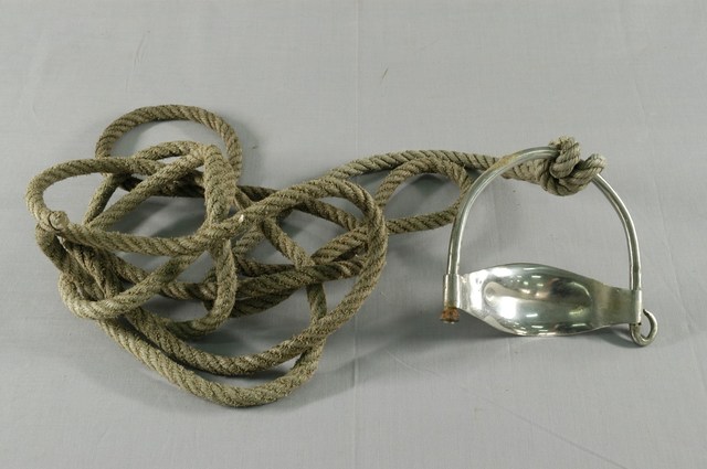 1.本物件為牛鐵樁與綁牛繩-牛鼻栓,為金屬材質,為U型鐵條與一葉片狀鐵片組成,鐵條兩端一側有倒鉤,另一側則鎖上螺帽,物件有鐵鏽情形。 2.牛鼻栓,當小牛在約2、3歲時,主人會將鐵製或籐製的鼻環,貫穿於牛的兩鼻之間,並系繫上繩索用以牽引耕牛。