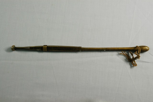 1.本物件為穿牛鼻器零件,為金屬材質,呈長條狀,頭端粗大有穿孔並繫有繩子,尾端成尖銳狀,中間連接另一金屬棒,可轉動,頂端成帽狀,物件有鐵鏽。 2.牛鼻栓,當小牛在約2、3歲時,主人會將鐵製或籐製的鼻環,貫穿於牛的兩鼻之間,並系繫上繩索用以牽引耕牛。