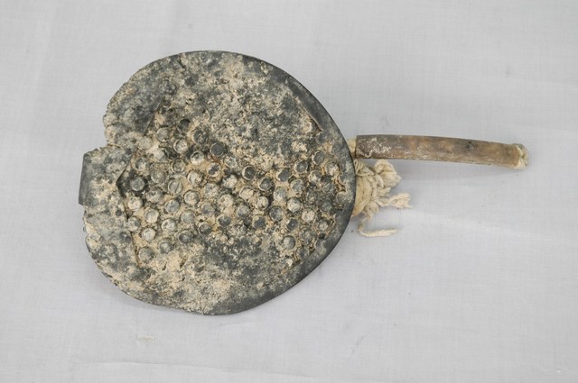 1.本物件為牛鞋,為橡膠材質,成類橢圓狀,前端較鈍,後端較尖,前後端各有一片狀突起,前端突起較高可置於牛蹄之間,兩個突起處皆有穿孔,有繫上粗棉繩,繩外裝有塑膠管。平面處有一圓形商標,內有一牛頭圖案,周遭有「臺中水特」字樣。底部有許多圓點凸起可增加摩擦力。
