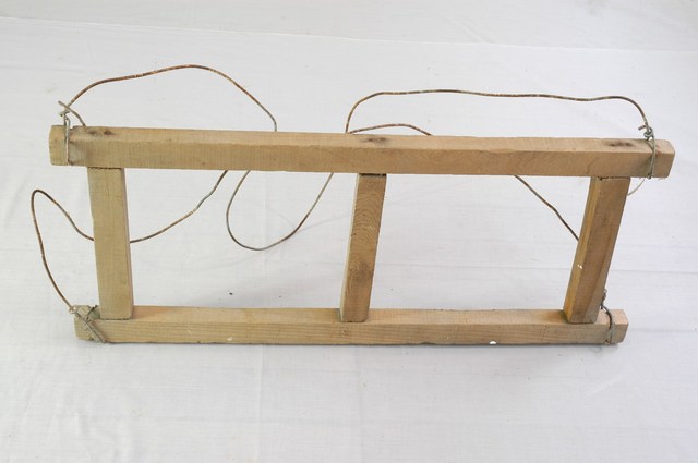 1.本物件為秧架,為木材質,由2長3短木條組成「日」字形木架,2長木條2端皆綁有鐵絲,並皆刻上凹痕,以固定鐵絲避免滑動。鐵絲有鐵鏽。
