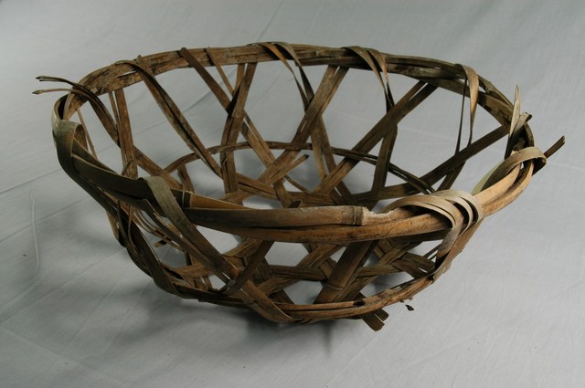 1.本物件為秧籃,為竹篾編成,形狀如臉盆,有污漬、灰塵。秧籃通常兩兩一組。 2.秧籃又稱「秧篦」,以竹片、篾編成,製作方法為以粗竹片1-2片圍成圓框,再以竹篾交叉編製。使用方式為農人以鏟子鏟起秧塊以便移植,疊放於秧籃上,插秧時則將秧籃置於秧船上。