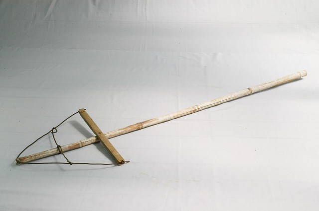 本物件為撥葉器,為竹製器具,一長竹竿,前端以綁有彎曲鐵絲如箭頭狀,鐵絲末端有一木棍與鐵絲形成一三角形。施肥或施藥時可把稻葉撥開,以便操作。