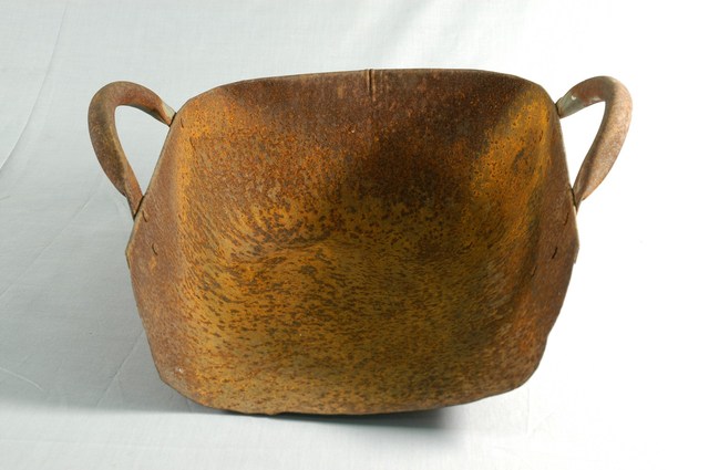 1.本物件為鐵畚箕,為金屬材質,主體由鐵片製成,兩側各有一把手,有鐵管彎曲,以螺絲連接主體,整體有鐵鏽情形。 2.畚箕,通常用竹片編織而成,用來裝較小物體的竹容器,依其編織密集程度不一可用來搬運米、砂等較細小物體或番薯、石頭等較大物品,後來則出現以鐵片製成的鐵畚箕。