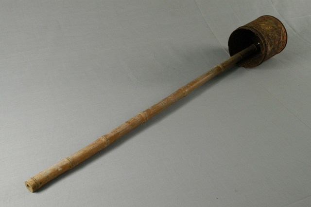 本物件為鐵罐勺,為竹及金屬材質,由鐵罐、細竹竿,組合而成,鐵罐部分有鏽蝕情形。