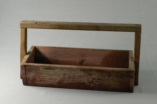本物件為工具箱,為木材質,主體由2梯形3長方形木板,以鐵釘拼接成一盒子,外面裝上由3根木棍煮成的ㄇ字型手把,盒身有紅漆,有剝落情形。