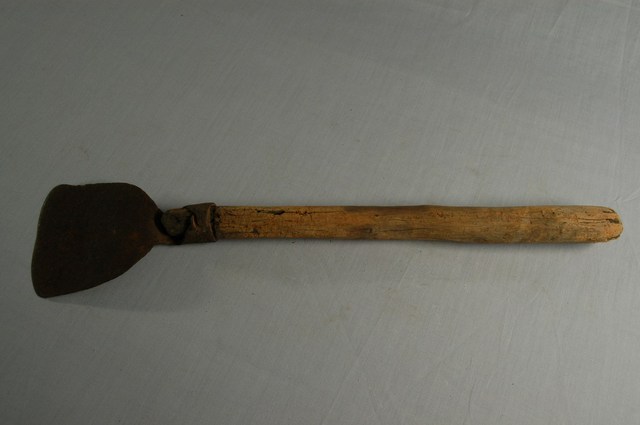 本文物為秧鏟,為1980年代農機普及前種植水稻常用的農具,以平口鐵鏟片與木柄構成。鐵鏟片後端連接鐵片,再接收捲成圓筒形箍以供置入柄,為清末至今漢人傳統農具作法。秧鏟有長柄、短柄不同,本件為短柄,通常用於水稻田。在水稻的秧苗培植至約三寸高時,需移栽到水田中。移植時,使用秧鏟將整片秧苗由秧田連根帶土成片鏟起,放置於秧披內。根據購藏來源資料,本件文物來自桃園。
