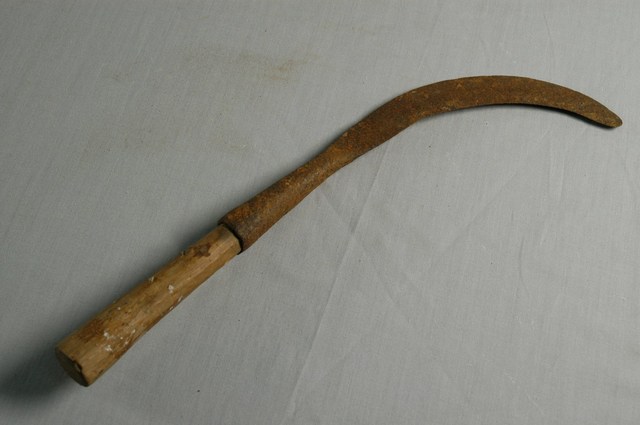 本文物為鐮刀,又稱草鐮、草刀、割草刀。鐮刀主要為收穫用農具,也在山林活動使用。用途主要為割草、割稻麥、藤蔓等。本件鐮刀的刀片為細長形,便於深入草桿間,一次割取草量較多。鐮刀基本形式為彎月形鐵片,內緣為刀刃。本件刀片後端作成圓筒箍形以置入短木柄,為清末至今傳統漢式農具作法。根據購藏來源資料,本件文物來自高雄。