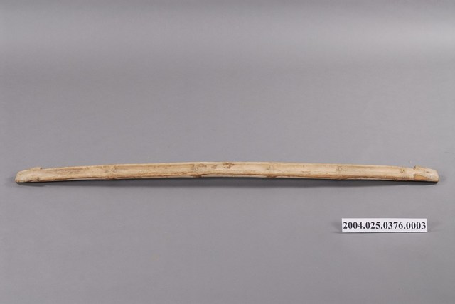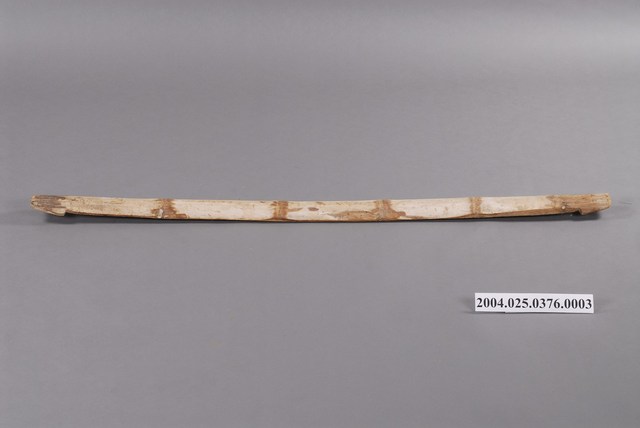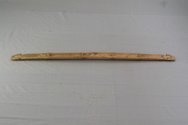 1.本物件為扁擔,為竹材質,唯一剖半竹筒,兩端各削有一倒鉤,供懸掛籮筐所用。 2.籮筐,以竹片編織而成,以繩索繫於堅硬木材或竹節製成扁擔上,是早期交通不便時,人力運輸的重要器具。