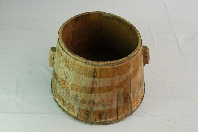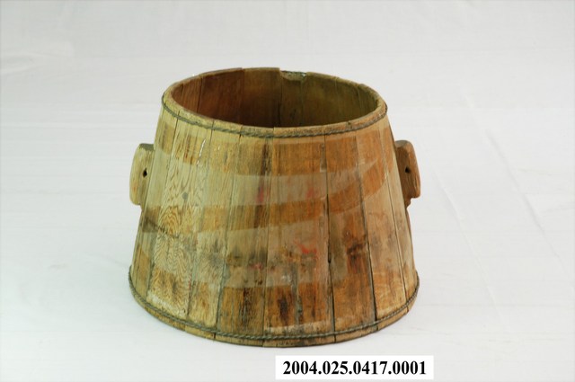 1.此物件為木製魚仔桶,是由木材所製成的漁具,此物件外觀為圓桶狀但寬度朝開口方向收縮,桶身上設有突起的繫繩處,開口部分有一處木材缺角。 2.魚仔桶也稱為魚苗桶,主要是用於裝載體積甚小的魚苗,有些魚苗甚至連肉眼都難以觀察到。為讓魚苗可以順利受精、孵化,一般農家多先選溫暖的室內進行魚苗的受精與孵化,待魚苗長出後,再利用魚仔桶移至魚塭等養殖區域。
