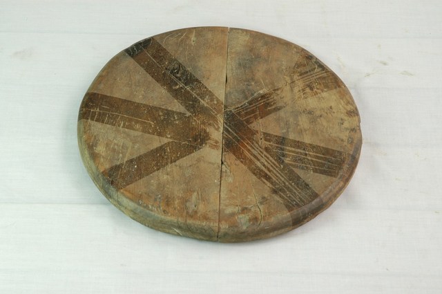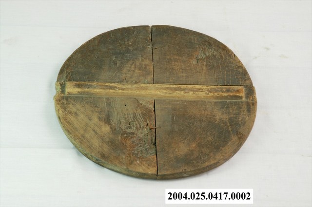 1.此物件為木製魚仔桶的桶蓋,是由木材所製成的漁具,此物件是由兩片木板拼接而成,外觀為圓盤狀,平面上挖有1長條凹槽。 2.魚仔桶也稱為魚苗桶,主要是用於裝載體積甚小的魚苗,有些魚苗甚至連肉眼都難以觀察到。為讓魚苗可以順利受精、孵化,一般農家多先選溫暖的室內進行魚苗的受精與孵化,待魚苗長出後,再利用魚仔桶移至魚塭等養殖區域。