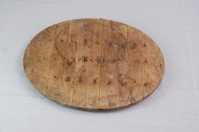 1.此物件為魚仔桶的木製桶蓋,是由木材所製成的漁具,此物件外觀為圓盤狀,是由數片木材拼接而成,平面上又各釘上三長條木材。 2.魚仔桶也稱為魚苗桶,主要是用於裝載體積甚小的魚苗,有些魚苗甚至連肉眼都難以觀察到。為讓魚苗可以順利受精、孵化,一般農家多先選溫暖的室內進行魚苗的受精與孵化,待魚苗長出後,再利用魚仔桶移至魚塭等養殖區域。