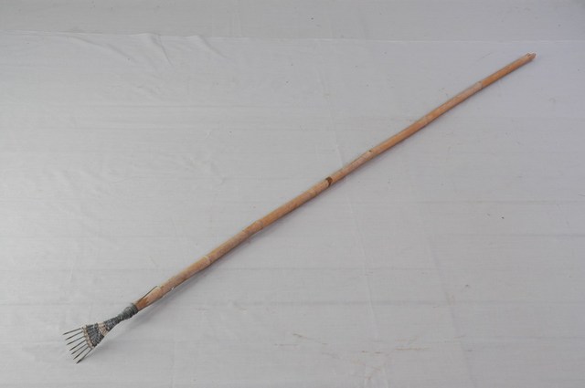 本文物為鰻叉,用來捕捉沙岸鰻的魚具。鰻叉以七支鐵製尖齒構成叉形,用來插住鰻身。叉齒以鐵線纏繞,固定於竹柄上。使用時將魚叉叉入濕泥中,叉住鰻身使其無法脫逃後,再用手入泥中輔助將鰻連叉抓出。本件叉齒前端生鏽。根據典藏來源資料,本件文物收集來源地在臺東。