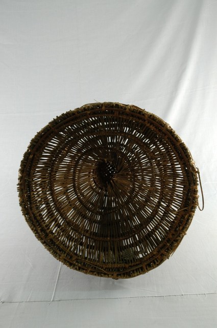 1.此物件為竹製魚筌,為一竹篾編織而成的瓶狀漁具,上方使用較粗的竹篾編織而隙縫較小,下方開口處內有向內收縮的漏斗狀設計。 2.魚筌為一種漁具與捕蝦籠有類似的用法,內置餌料後放置於溪流中,待魚或是蟹等漁獲進入後便會因水流及開口設計等因素而無法逃出。