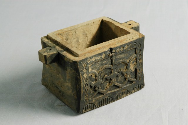 達悟族漁具盒之盒身,外形呈黑褐色之四方體,以一整片木料刨刻而成,內部挖空,內壁可見刨鑿痕,中無分隔。器身外側正面及背面雕刻達悟族人形紋,四圍環繞鋸齒紋、半圓形紋等。近開口處左右兩側各有一方形突起,中央鑿有小孔,主要用來綁縛線繩,與盒蓋緊縛固定方便攜帶。