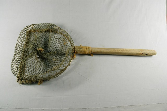 1.本物件為一撈網,由麻繩打成麻結,編成撈網主體,並以鐵圈為主,環繞成網狀,另一邊以木頭綁於鐵圈上,並以麻繩固定,便於使用。 2.用途:撈魚使用工具,要從魚下方往上撈,將魚體拉舉起來,在魚被拉進來魚網的路徑上,然後兩手協力趁勢將魚送入網中,一般魚撈進網裡之後,把網框出水面,邊收撈柄邊拖到腳邊,然後再往上收提。