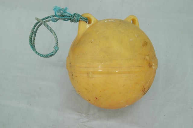 1.本物件為浮標,為塑膠材質,為空心塑膠球,便於浮在海上,球體上方並有兩個提耳,可以串入繩子連結其他服標,本物件其中一耳並繫上綠色棉線,大多為較為醒目的顏色,在海中較為明顯。 2.用途:可以用於漁網上,使漁網漂浮在水面,通常從事捕撈作業時綁在漁網上的浮標,利用浮球會浮在水上的特性,將浮球沿著繩子垂釣,放在水上作為抓魚的記號。