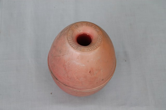 1.本物件為浮標,為塑膠材質,為空心塑膠球,便於浮在海上,大多為較為醒目的顏色,在海中較為明顯,本物件一邊並有空心開口,上方有「景星有限公司」字樣。 2.用途:可以用於漁網上,使漁網漂浮在水面,通常從事捕撈作業時綁在漁網上的浮標,利用浮球會浮在水上的特性,將浮球沿著繩子垂釣,放在水上作為抓魚的記號。