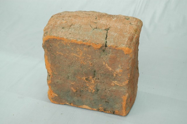大角磚,用於傳統漢式建築的地基或壁體,或磚瓦窯的窯壁或窯門。本件磚長寬與尺磚、瓦相似,可能於磚瓦窯窯燒作為坯腳上的墊磚,上承磚瓦生坯。臺灣由清中葉開始本地即有磚瓦窯,此外,為建築廟宇或大宅,常於建築基地附近設置臨時的磚瓦窯燒製該次建築用磚,大角磚先作為燒窯用途,燒製完成後即用於建築地基或牆體。窯場建築及燒窯使用的大角磚,自清代至今皆維持不變。大角磚製作方法與土埆磚相同,因此具有一般土埆磚的外形特徵,即四個側面的切面與底面平整,頂面粗糙不平。