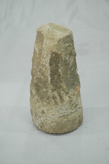 為石門臼組之一,共二件,形式相同,應為同一對雙開門之門臼。門臼為門的構件,圓形孔洞用以插入門扇的門軸。本件門臼為下門臼,置於門豎後方。底部插入地面。與門豎貼合及地面以下的石材表面未磨光,外露三側面磨光並做圓角。根據典藏來源資料,本組文物收集來源地在屏東。