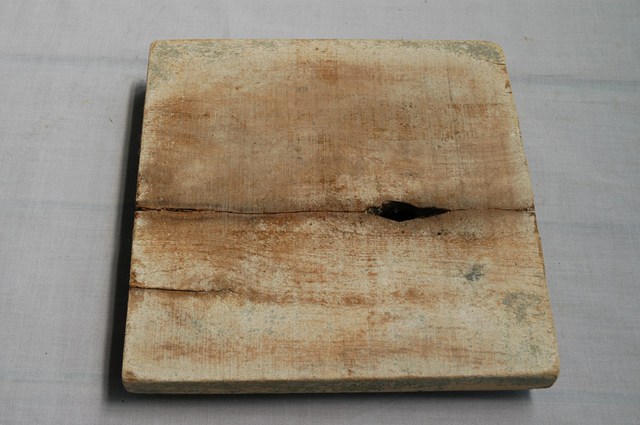 本件文物為館藏號2004.025.0525花磚木模的外模構件,為底板。底板外圍是放置邊框的位置,中間三個凹洞則放置內模木塊。底板的凹洞與邊框、內模的形狀密合,可使邊框及內模木塊在灌注材料時不致移位,且脫模時容易拿起。木模用以模製花磚。