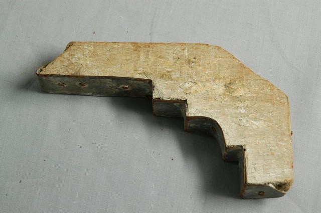 本件文物為拖板線,是土水匠師作天花板或外檐線腳的外模工具,線腳為日本時代以後所傳入的洋式建築作法。視各建物施作的需要製作不同的模子。拖板線以木模切割成線腳的斷面,包括弧線及直線,與灰漿接觸面常包覆鐵片以加強耐用度。施作時以平行拖動方式塑出線腳表面。 舊系統記錄屏東,可能為取得來源地。