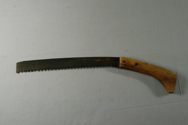本文物為手鋸組的手鋸。為日本時代引入的伐木用鋸,伐木鋸特徵為鋸片後端鐵片插入木柄凹槽,鋸片與木柄呈人字形。本件手鋸以鐵釘固定鋸片和木柄,為1960年代以後根據典藏來源資料,本件工具來自花蓮。臺灣的工具店發展的作法。手鋸適合橫切直徑約一尺半以下的樹材,將樹材切成便於搬運的長度,亦適合農人鋸切樹枝供作薪柴使用。根據購藏來源資料,本件工具來自花蓮。