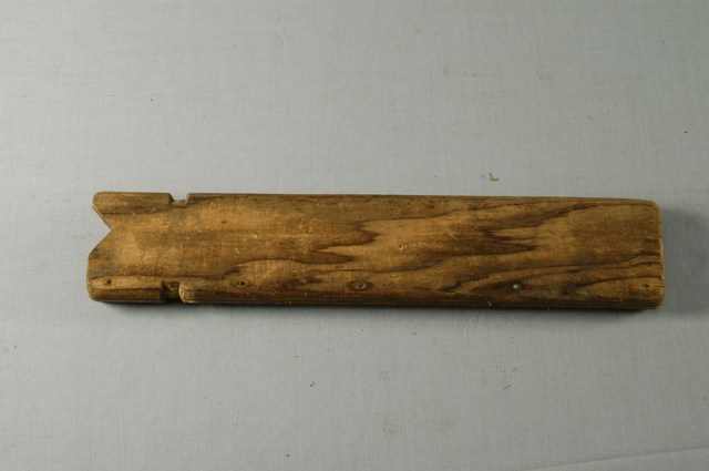 本文物為手鋸組的鋸套。為日本時代引入的伐木用鋸,伐木鋸特徵為鋸片後端鐵片插入木柄凹槽,鋸片與木柄呈人字形。本件手鋸以鐵釘固定鋸片和木柄,為1960年代以後臺灣的工具店發展的作法。本件鋸套為木製,以鐵釘固定,將鋸片包住,便於攜帶。手鋸適合橫切直徑約一尺半以下的樹材,將樹材切成便於搬運的長度,亦適合農人鋸切樹枝供作薪柴使用。根據購藏來源資料,本件工具來自花蓮。