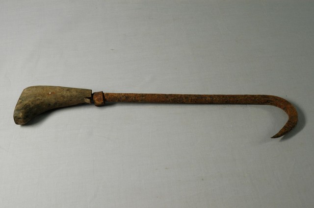 本文物為手鉤,為搬運工勾住貨物移動的工具。日本時代由日本引入。手鉤為鐵製鉤頭,鉤身長,鉤身後端插入木柄內,外以鐵箍強化固定。鐵箍為戰後發展出的作法。木柄後端加粗具平底座便於握持。有長柄、短柄兩類,適用於不同物品的勾取,本件為短柄,鉤彎且厚實,適用於搬運綁繩箱籃貨品等,以手鉤勾住拖移,最早引入時多用於糖業、船舶等日資或官方事業,後普及為農漁業搬運使用,可用於勾取農魚貨等,用途廣泛。根據購藏來源資料,本件工具來自屏東。