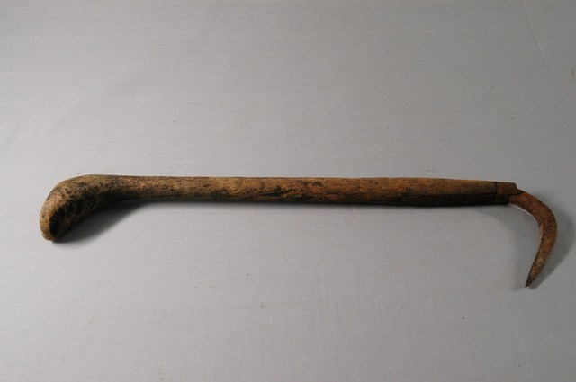 本文物為手鉤,為搬運工勾住貨物移動的工具。日本時代由日本引入。手鉤為鐵製鉤頭,彎鉤與木柄方向垂直,鉤尾收成鐵箍形以套入木柄,鐵箍與木柄間塞入長鐵片固定。木柄略彎曲,後端加粗具平底座便於握持。有長柄、短柄兩類,適用於不同物品的勾取,本件為長柄,鉤身厚實,適用於搬運麻袋、綁繩箱籃貨品,搬運工在搬運麻袋類貨物時以手鉤勾袋拖移,最早引入時多用於糖業、船舶等日資或官方事業,後普及為農漁業搬運使用, 可用於勾取農魚貨等,用途廣泛。根據購藏來源資料,本件工具來自屏東。