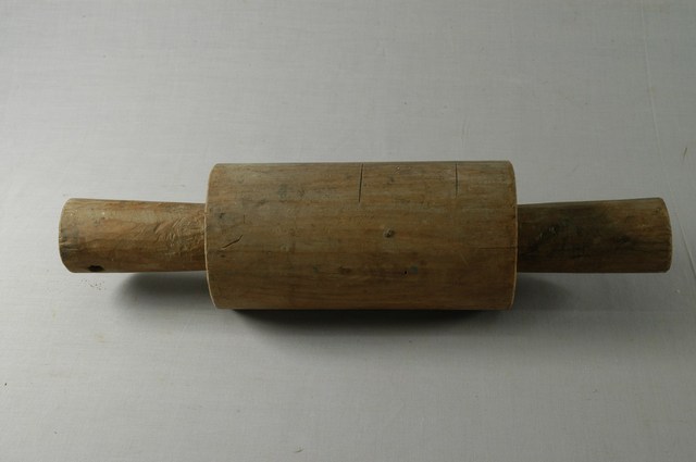 1.本物件為木製碾輾藺草的工具,又稱「研槌」,左右雙握柄,圓柱體,輾草處較大。