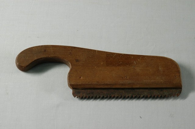 本文物為鋸草手鋸,以鋸片和木握把構成。是做草編、竹籐編時用來鋸草、藤條、竹篾的工具。根據購藏來源資料,本件工具來自南投。