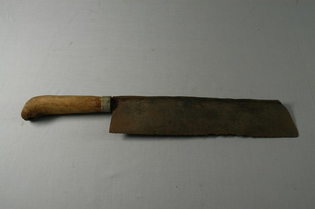 本文物為切草刀,以刀片和木握把構成,形式類似菜刀類刀具。是草編的工具,用來將草莖切斷。刀面長,刀口平,增加一次切除數量。刀背突出刀面,使刀片能插放在一字型縫隙的支架內。刀刃缺角受損。根據典藏來源資料,本件文物收集來源地在南投。