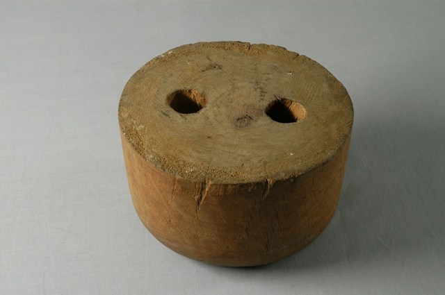 1.本物件為木製圓柱形草帽模,底部有兩個圓形孔洞,又稱「帽仔模」,用於編織草帽頭型。草帽模是要編草帽時有一個帽模,編帽人在帽模上來編,如此帽子大小都有一定的形狀,雖是手工,但定型可量產。