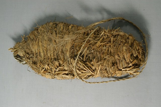 草鞋,以稻草、黃麻等天然纖維編織而成的鞋子,由於材料便宜,是工業化發展前普通百姓常穿的一種鞋子。臺灣早期農業社會,一般人多打赤腳走路,唯有出遠門或從事挑夫工作需長途跋涉時,才穿上草鞋。草鞋除了保護雙腳的功能外,也使用在特定的場合上,例如喪禮孝男及抬棺者穿草鞋、或跳鍾馗等宗教祭祀儀式中,具有避邪等特殊的象徵意義。本物件為一雙草鞋中的左腳部分。